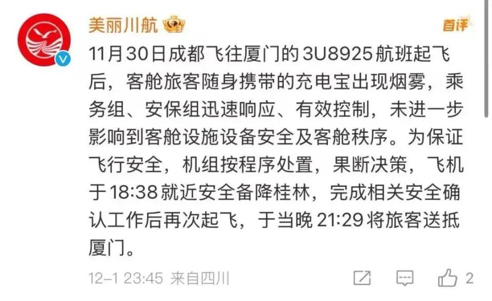此事經報道後,@美麗川航 官方賬號留言回覆:“11月30日成都飛往廈門的3U8925航班起飛後,客艙旅客隨身攜帶的充電寶出現煙霧,乘務組、安保組迅速響應、有效控制,未進一步影響到客艙設施設備安全及客艙秩序。爲保證飛行安全,機組按程序處置,果斷決策,飛機於18:38就近安全備降桂林,完成相關安全確認工作後再次起飛,於當晚21:29將旅客送抵廈門。”