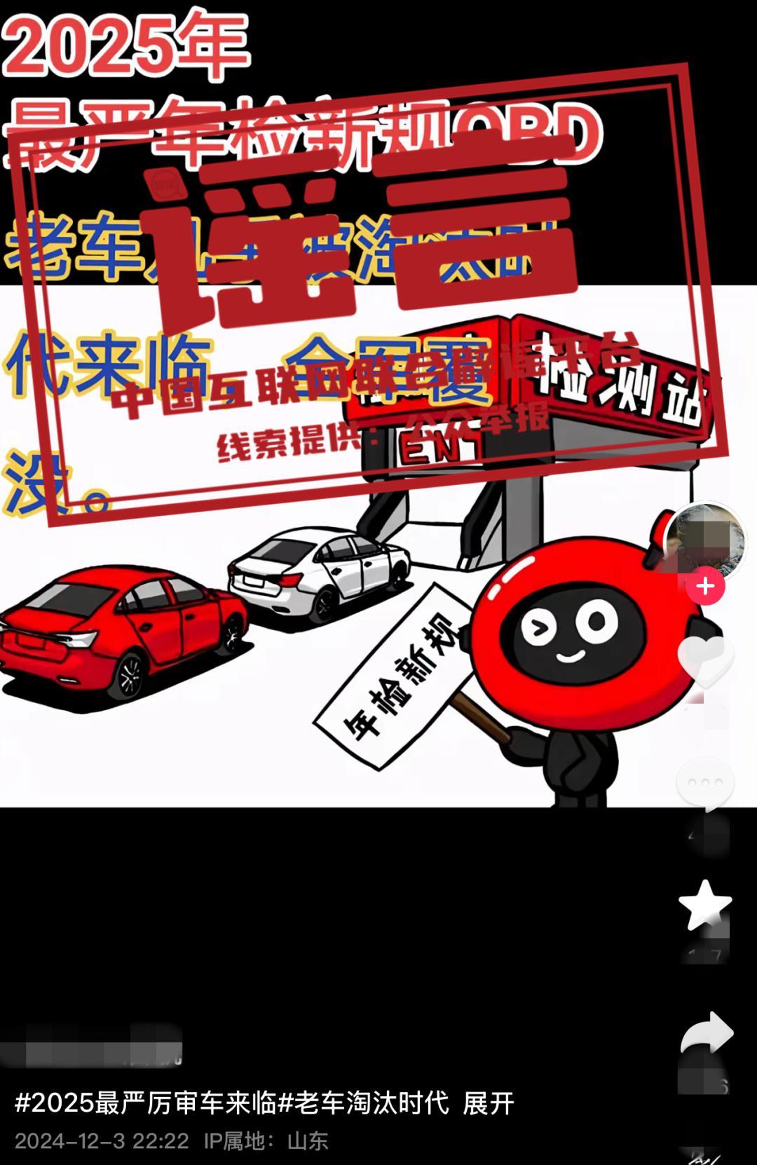 真相:近日,多個自媒體賬號發佈消息,宣稱“史上最嚴車檢來了”“車檢年限變化”“燃油車年檢增加OBD檢測”等。中央廣電總檯中國之聲記者多方求證瞭解到,上述說法均爲不實消息,目前各地車檢並沒有新變化。