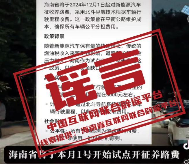 真相:近日,一些自媒體炒作“海南將於2024年12月1日起對新能源汽車徵收養路費”的消息,引發關注。12月5日,海南省交通運輸廳工作人員回應稱相關消息是假消息。截至目前,海南從未發佈過收取新能源車輛的車輛通行附加費相關政策。(來源:@海南網絡舉報、“海南省交通運輸廳”微信公衆號、南海網)