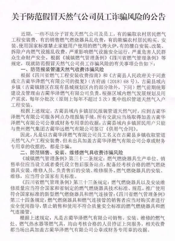 員工上門安裝燃氣燃燒器具並收取安裝費?古藺華澤燃氣有限公司提醒:務必覈實身份