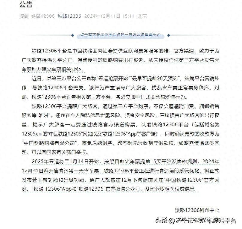 針對日前某第三方平臺公開宣稱“春運搶票開始”“最早可提前90天預約”信息,12月11日,鐵路12306科創中心發佈公告稱,該信息純屬平臺營銷炒作,與鐵路12306平臺無關。2025年春運將於1月14日開始,按照目前火車票提前15天開始發售的規則,2024年12月31日將開售春運第一天火車票。
