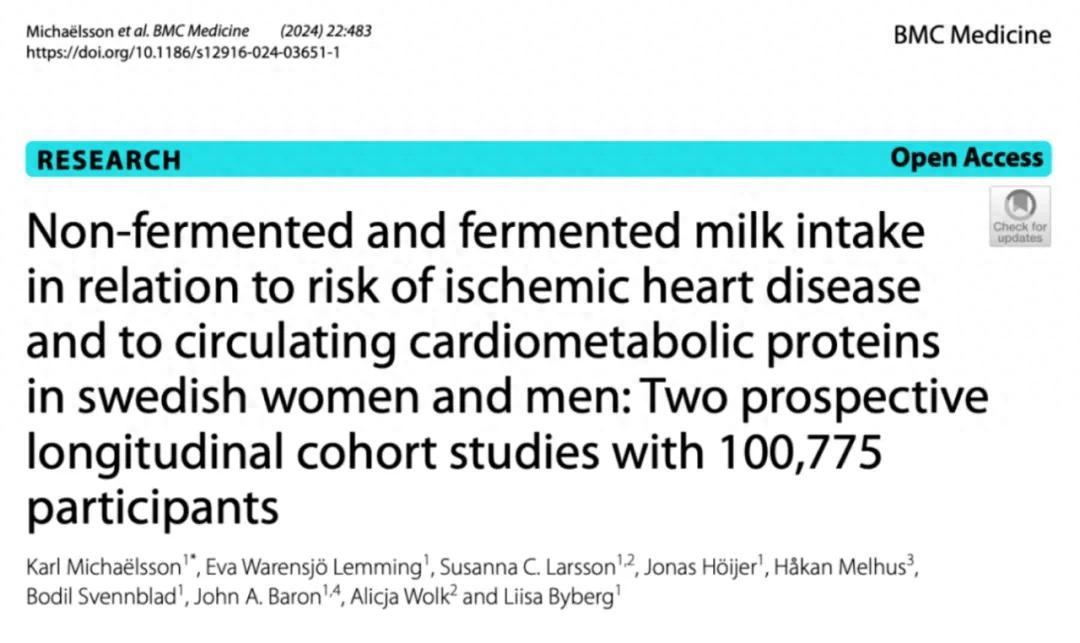 [1]Michaëlsson, K., Lemming, E.W., Larsson, S.C. et al. Non-fermented and fermented milk intake in relation to risk of ischemic heart disease and to circulating cardiometabolic proteins in swedish women and men: Two prospective longitudinal cohort studies with 100,775 participants. BMC Med 22, 483 (2024). https://doi.org/10.1186/s12916-024-03651-1