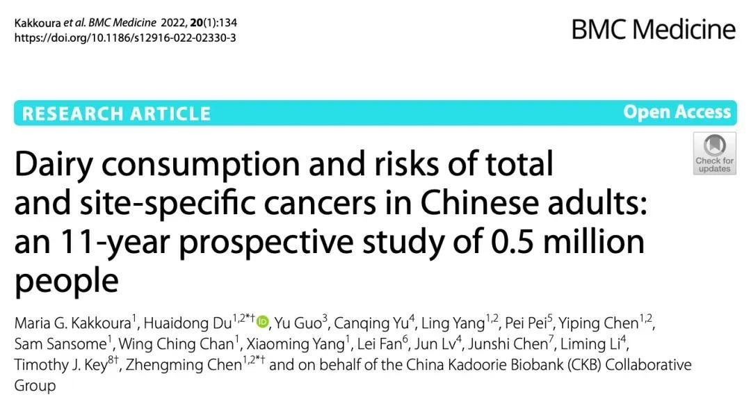 [4]Kakkoura, M.G., Du, H., Guo, Y. et al.,(2022). Dairy consumption and risks of total and site-specific cancers in Chinese adults: an 11-year prospective study of 0.5 million people.BMC Med 20, 134 (2022). https://doi.org/10.1186/s12916-022-02330-3