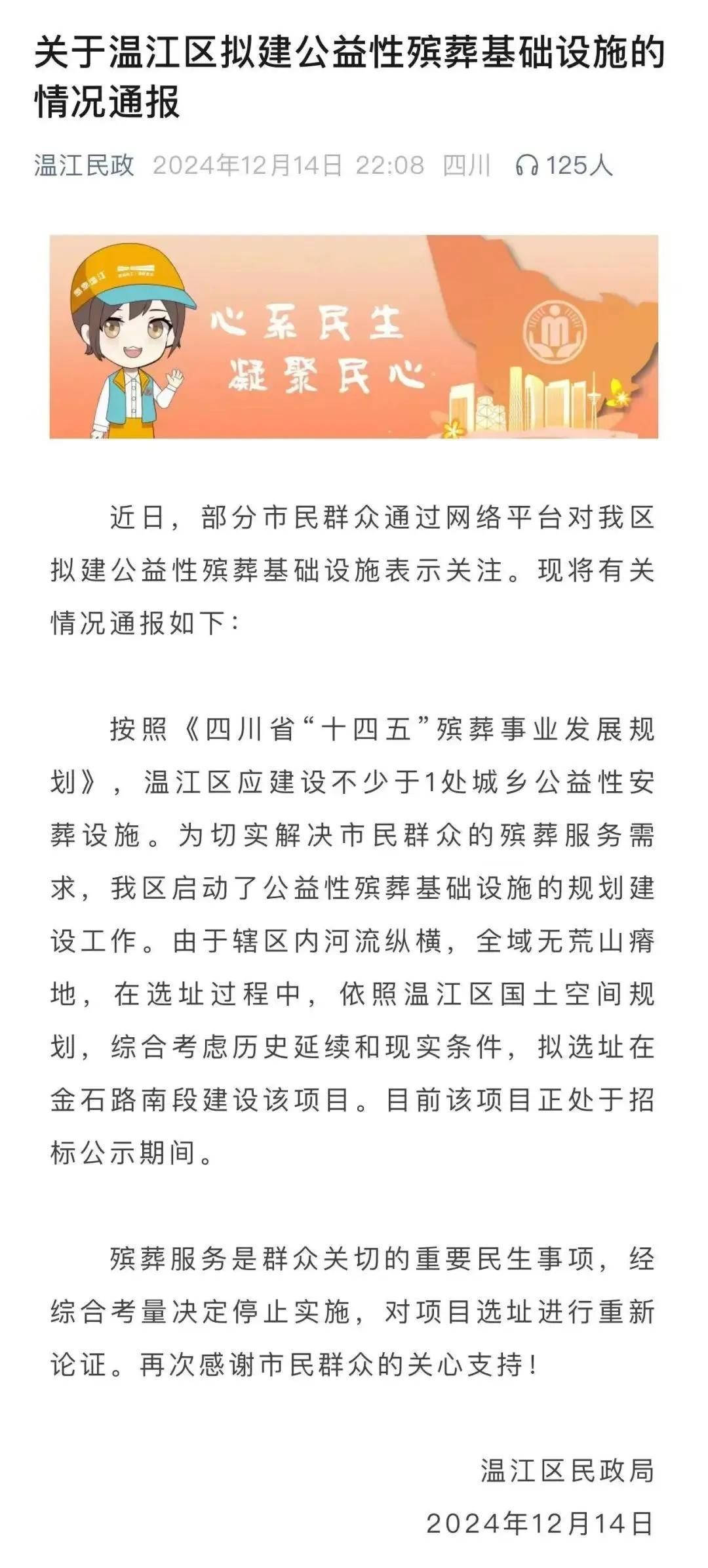溫江區擬建火葬場?區民政局:信息不實