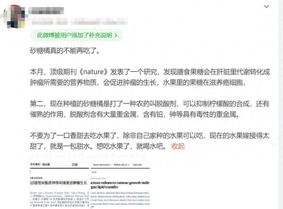 最近,一條關於“砂糖橘真的不能再喫了”的消息“炸”了。該消息說,頂級期刊《自然》(nature)一項研究發現膳食果糖會在肝臟裏代謝轉化成腫瘤所需要的營養物質,會促進腫瘤的生長,水果裏的果糖在滋養癌細胞。並說,現在種植的砂糖橘是打了一種農藥叫脫酸劑,可以抑制檸檬酸的合成,還有催熟的作用,脫酸劑含有大量重金屬,含有鉛,砷等具有毒性的重金屬。網絡平臺截圖這個研究是怎麼回事?真的不能喫砂糖橘了嗎?網傳消息誇大了砂糖橘的危害消息中提到的論文確實存在,但是它完全歪曲了論文的原意,並且誇大了砂糖橘的危害。首先,這篇研究是一個動物實驗。這個研究是用已經得了癌症的小鼠來做的,小鼠喂的是高果糖漿,結果發現,這些小鼠的腫瘤長得更快了。論文結論是腫瘤細胞不能直接利用果糖,因爲腫瘤細胞沒有表達KHK-C (果糖代謝的關鍵酶),但是肝臟代謝產生的一些中間產物(如血磷脂酰膽鹼LPC),這些產物能夠被腫瘤細胞吸收利用,進而促進腫瘤的生長。所以,果糖可能會促進腫瘤細胞生長。最重要的是,這個研究中根本沒有提到砂糖橘或者其他水果,砂糖橘完全是作者自己的歪曲演繹。它是這樣演繹的——“因爲高果糖漿中有大量果糖,砂糖橘也含有果糖,因此砂糖橘致癌,不能喫”。不過,如果按照這個演繹方式,那麼幾乎所有甜的水果都因爲“含有果糖”而不能喫了,因爲果糖是很多水果中非常常見的一種糖分,就沒有水果可以喫了。其實,這個研究是一個基礎醫學研究,證據等級是比較弱的。類似的基礎醫學研究特別多,有動物實驗,還有體外細胞實驗等,如果大家經常看科學新聞就會看到每年都會有很多類似的研究發表,但是距離臨牀應用還有很遠的路。對於我們來說,平時飲食按照膳食指南的建議安排每日三餐就可以,並不用太擔心。正確使用營養劑增甜無任何副作用關於“脫酸劑”,一些地方農業部門發現“甜蜜素”“脫酸劑”“去酸增甜劑”等都是沒有登記的三無產品,一些產品可能有砷酸鹽。砷酸鹽殘留容易對環境和人類健康造成威脅,在當前食品安全管理中,是禁止使用的,使用者和提供者都將受到法律的制裁,特別是當前國家對於食品安全監管嚴格,一旦被查處,果農和果商都要承擔相應的法律責任,很多果農也意識到這種東西的害處,一般不會同意使用。但是,正確使用營養劑增甜是無任何副作用的,大家也不用對農業種植過程中正規的做法擔驚受怕。目前,很多肥料廠家都在推廣含有磷鉀等元素的肥料,用來促使柑橘等增加甜度,這樣的營養液都是正規登記的,可以正常使用,對於樹體無害,也不會造成任何農殘超標等,農戶完全可以選擇類似葉面肥、磷酸二氫鉀之類來提高果實甜度,這些都屬於營養肥料,無毒副作用。使用高磷高鉀等葉面肥作用機理是提高光合作用效率,增加光合產物,加速營養物質製造和轉化,積累有機物等。總的來說,我們買的正規砂糖橘是可以放心喫的。大衆不必恐慌這種所謂“新研究”謠言是典型的對科研論文片面、誇大演繹解讀式謠言,這類謠言通常披着“最新研究”的外衣,給出一些看似權威、專業又誇大的結論。這些新研究通常樣本數據很小,大多僅限於動物試驗,許多研究並沒有達成定論,但一些解讀者卻常常忽視這些關鍵因素,誇大那些缺乏定論的結論,甚至會無中生有進行聯想,推理得出一些所謂的結果,並進行廣泛再傳播,導致謠言滋生,引發公衆恐慌。對於許多網友來說,大多數人不會查閱原始文獻,而且許多內容過於專業,令人難以理解。不少人看到廣爲流傳的消息時,很容易被帶偏誤信。專業的事情交給專業的人,建議大家多諮詢權威人士的專業判斷。本文來源:科學闢謠微信編輯:大白還原事實,洞悉真相。歡迎關注,留言舉報!