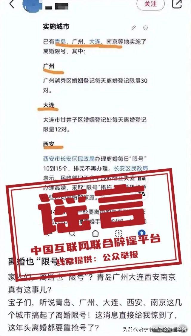 真相:近日,一則“離婚限號”的消息在網上流傳,稱南京、青島、廣州、大連、西安等多個城市的婚姻登記處對離婚業務進行了數量限制,引發網民關注。經媒體求證,上述城市多個婚姻登記處均明確表示不存在“離婚限號”,並未對離婚業務量限額。婚姻登記處大都採取網上預約和現場排隊相結合的方式,一般優先辦理線上預約的離婚申請。調查發現,一些搜索引擎“離婚限號”詞條引用消息來源多截取自2013至2014年的新聞報道。(來源:“江蘇新聞”微信公衆號、頂端新聞)