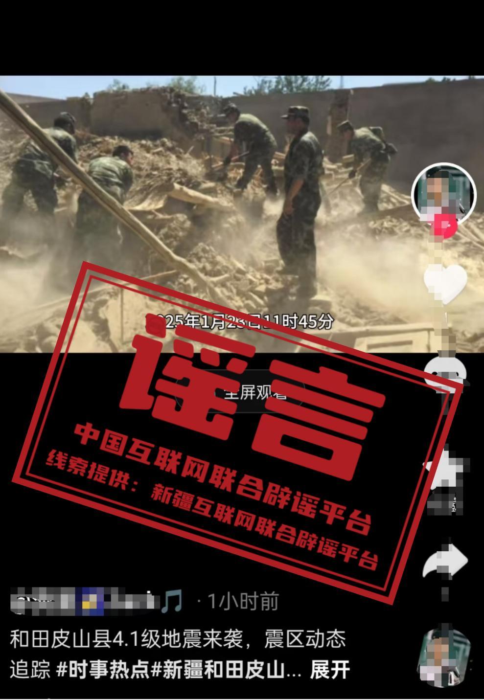 真相:中國地震臺網正式測定,2025年01月23日11時45分在新疆皮山縣(緯度36.94°,經度78.87°)發生4.1級地震,震源深度15公里,震中附近地形類型爲山地,5公里範圍內平均海拔高度爲2484米,距離皮山縣92公里。個別網民關聯此次地震,發佈“房屋倒塌、道路坍塌及應急救援”等謠言圖片和短視頻,博取流量誤導網民。經皮山縣應急管理局覈實,此次地震未造成人員傷亡及財產損失。對編造散佈地震謠言擾亂公共秩序、造成惡劣社會影響的行爲,公安機關將依法依規嚴肅查處。請廣大網民擦亮眼睛,勿輕信傳播非正規來源、未經證實的地震信息。(來源:新疆網絡闢謠)