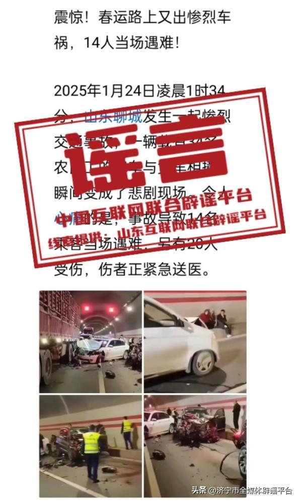 真相:近日,有網民在網絡平臺發佈一則“山東聊城一隧道內發生多車相撞”的信息,稱“現場多車發生嚴重碰撞,場面慘烈,羣衆滯留”,引發關注。經當地警方覈實,山東省聊城市從未發生過類似交通事故,該信息內容純屬虛假編造。經查,網民褚某某和韓某爲博取關注、吸引流量,將外省市發生交通事故的圖片視頻移花接木,稱“聊城發生交通事故”並憑空捏造傷亡人數,造成不良影響。目前,二人已被公安機關依法打擊處理。(來源:山東互聯網聯合闢謠平臺、聊城市網上闢謠平臺)