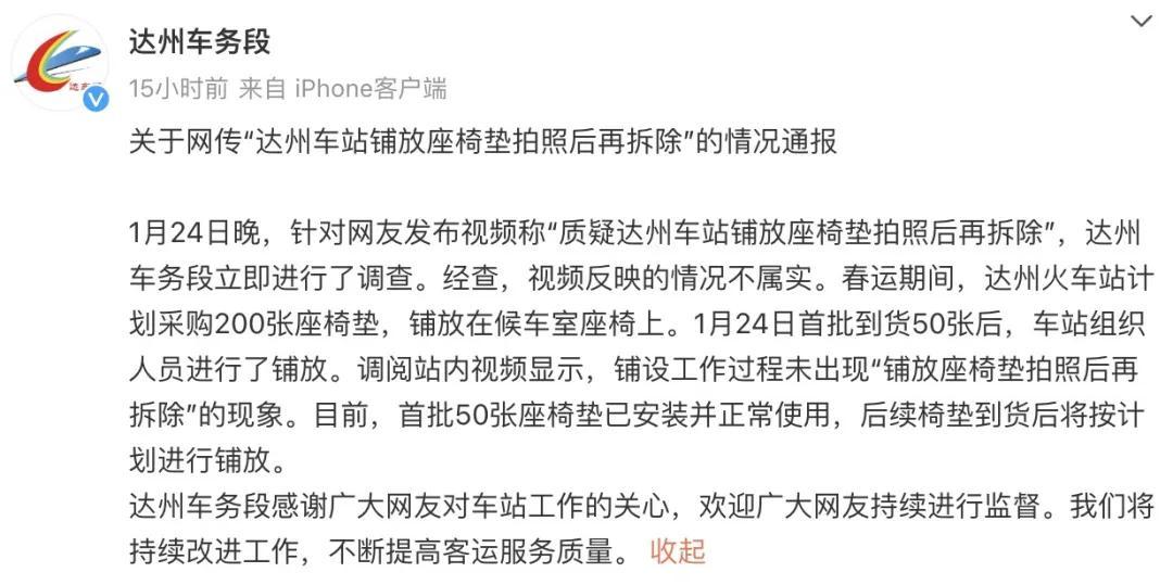 1月25日晚,成都鐵路局達州車務段官方微博發佈情況通報稱,1月24日晚,針對網友發佈的視頻質疑“達州車站鋪放座椅墊拍照後再拆除”,達州車務段進行了調查。經覈實,視頻反映的情況並不屬實。