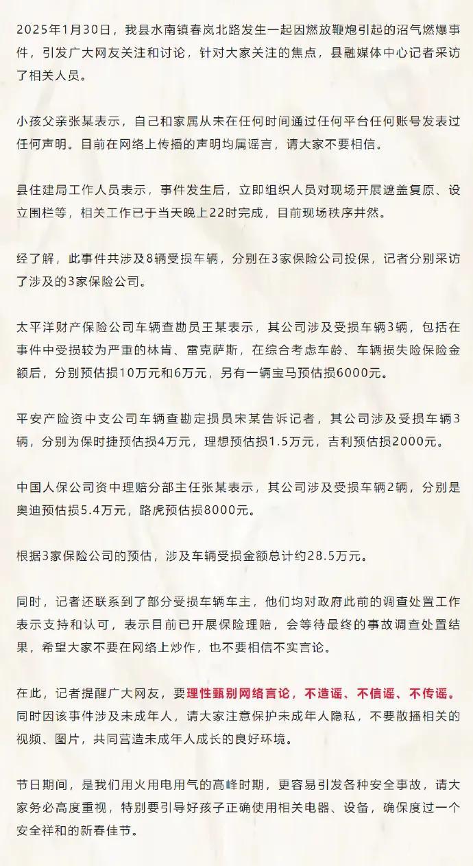2月1日晚,據四川資中縣融媒體中心消息:1月30日,四川內江市資中縣水南鎮春嵐北路發生一起因燃放鞭炮引起的沼氣燃爆事件。經瞭解,此事件共涉及8輛受損車輛,分別在3家保險公司投保。根據3家保險公司的預估,涉及車輛受損金額總計約28.5萬元。同時,記者還聯繫到了部分受損車輛車主,他們均對政府此前的調查處置工作表示支持和認可,表示目前已開展保險理賠,會等待最終的事故調查處置結果,希望大家不要在網絡上炒作,也不要相信不實言論。(來源:弘資中)