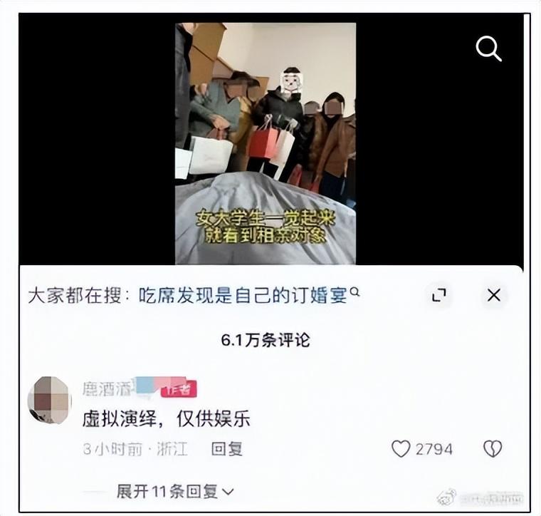 近日,“女生一覺醒來相親對象已站牀邊”衝上多平臺熱搜,但多位網友質疑這條視頻涉嫌擺拍。2月2日,這段視頻原發博主“鹿酒酒”將該視頻標註爲“虛擬演繹,僅供娛樂”。