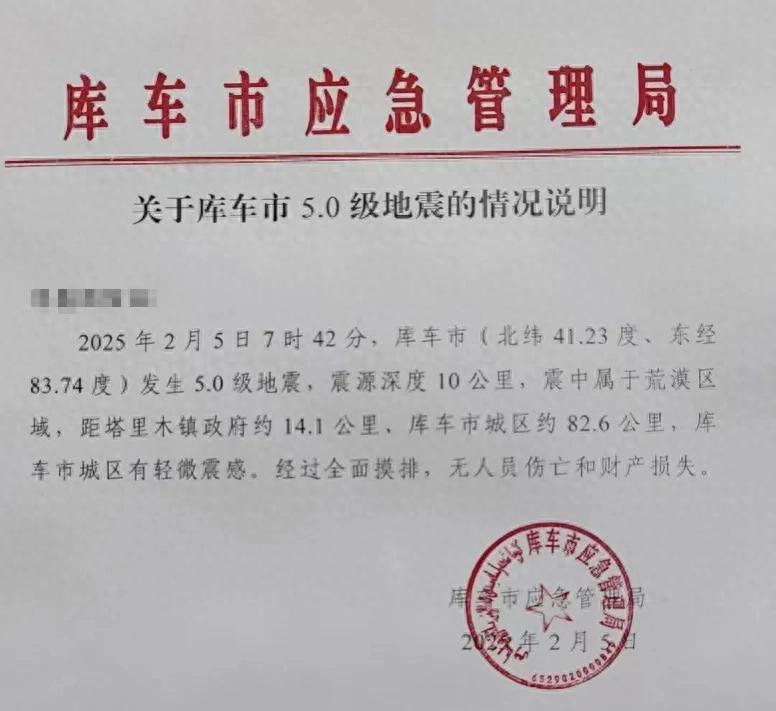 據中國地震臺網消息:02月05日07時42分在新疆阿克蘇地區庫車市(北緯41.23度,東經83.74度)發生5.0級地震,震源深度10千米,震中屬於荒漠區域,距塔里木鎮政府約14.1公里、庫車市城區約82.6公里,庫車市城區有輕微震感。