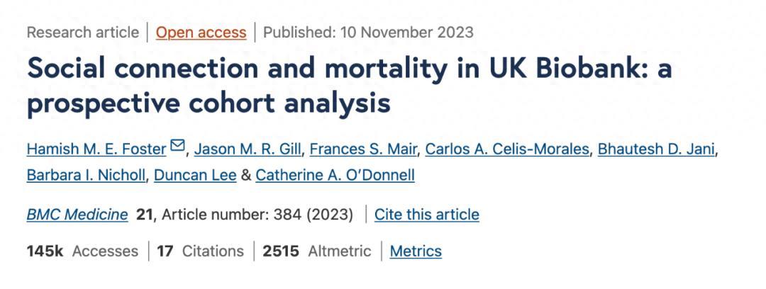 [1] Foster HME, Gill JMR, Mair FS, Celis-Morales CA, Jani BD, Nicholl BI, Lee D, O''Donnell CA. Social connection and mortality in UK Biobank: a prospective cohort analysis. BMC Med. 2023 Nov 10;21(1):384.