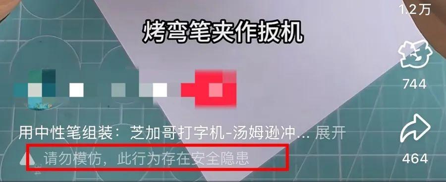 而在提示“筆槍”風險方面,只有部分視頻下方有“請勿模仿,此行爲存在安全隱患”的淺色標籤。若不仔細辨別,很容易忽略。