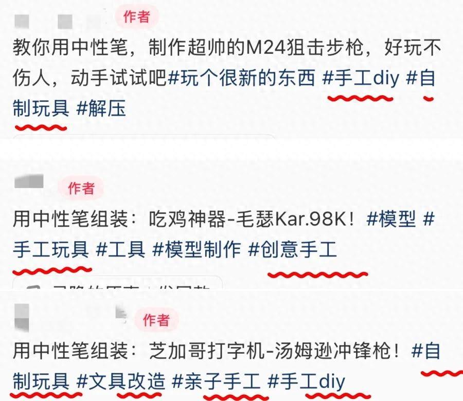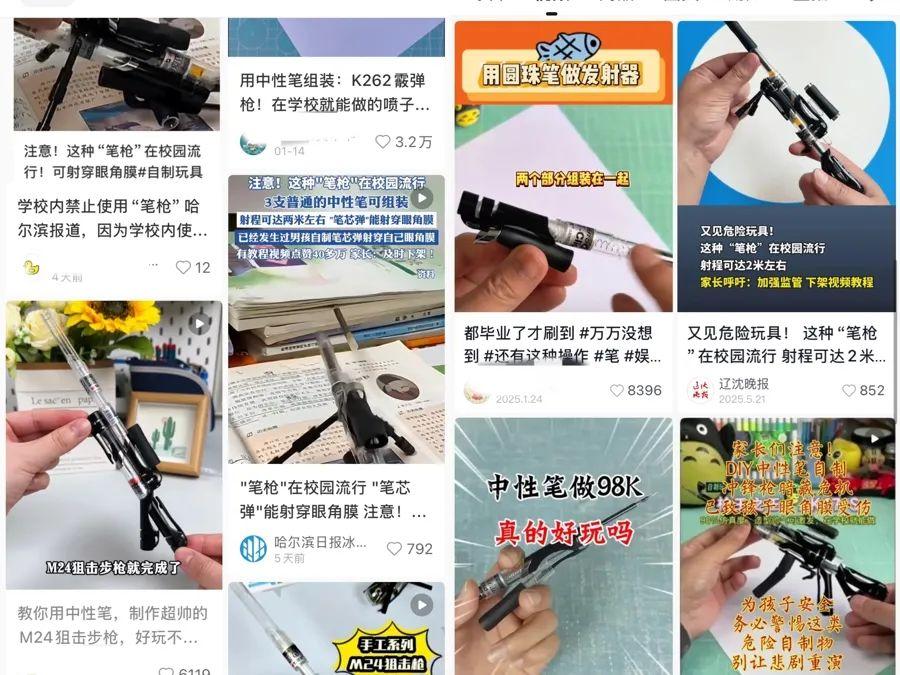 記者調查發現,孩子們玩耍的“筆槍”原材料都是普通的中性筆或圓珠筆,將筆的彈簧、筆芯、筆桿、軟膠套等部件拆下後,重新組裝而成。多家社交平臺上都有詳細的組裝視頻,甚至細分到不同槍型。正如老師所言,這類視頻大多冠以“創意手工”“自制玩具”“手工DIY”等標籤。
