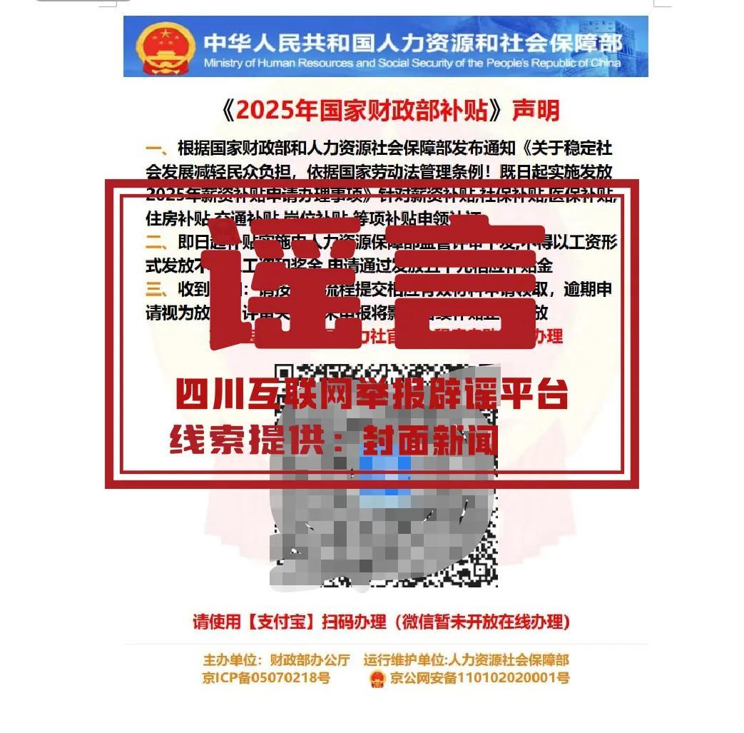 日前,有四川網民反映,通過短信等各種渠道收到所謂《2025年國家財政部補貼》聲明。