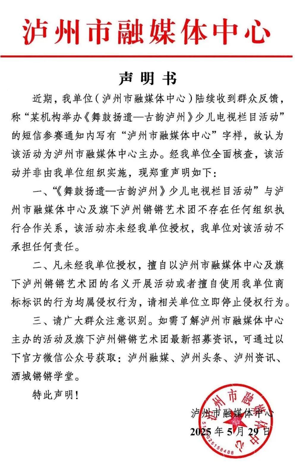詳情:近期,瀘州市融媒體中心陸續收到市民反饋,稱“某機構舉辦《舞鼓揚遺-古韻瀘州》少兒電視欄目活動的短信參賽通知內寫有“瀘州市融媒體中心”字樣,故認爲該活動爲瀘州市融媒體中心主辦。經單位全面覈查,該活動並非由瀘州市融媒體中心單位組織實施。