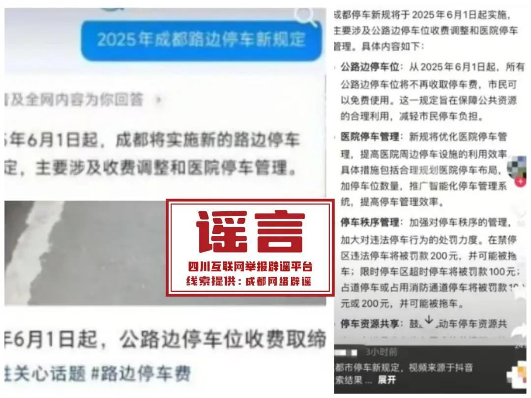 近日,個別網民在網絡平臺發佈信息稱,“成都市停車新規定,從2025年6月1日起,所有公路邊停車位將不再收取停車費,市民可以免費使用”,引發輿論關注。