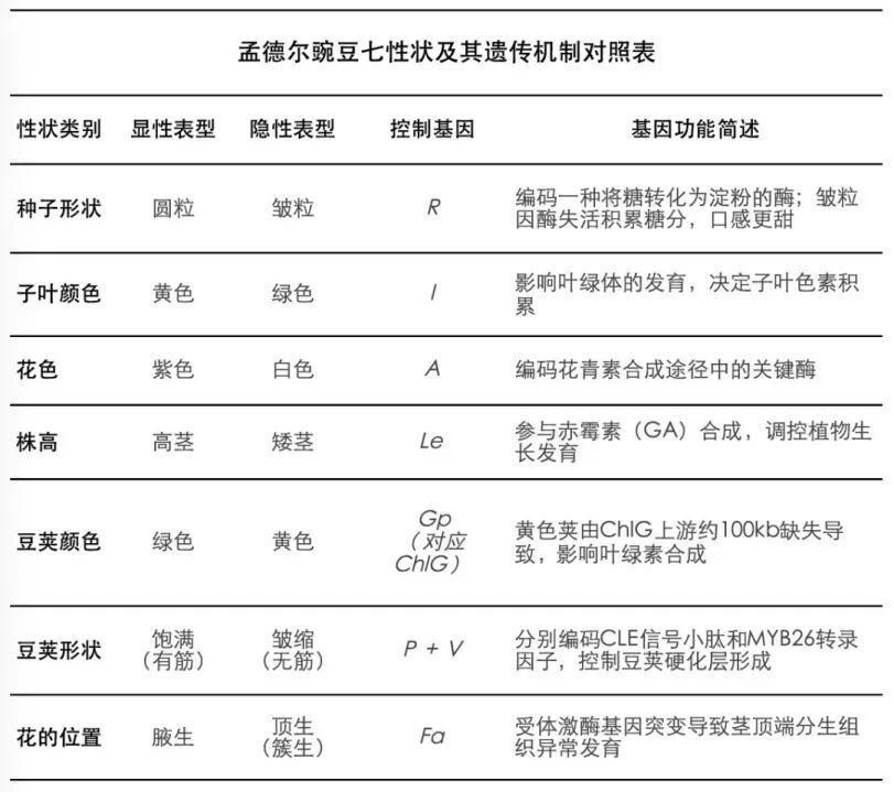 孟德爾在 19 世紀中葉通過對豌豆的雜交實驗,觀察並記錄了七對性狀的遺傳規律。在過去的 30 年中,研究人員已成功克隆並解析了其中四對性狀對應的基因: