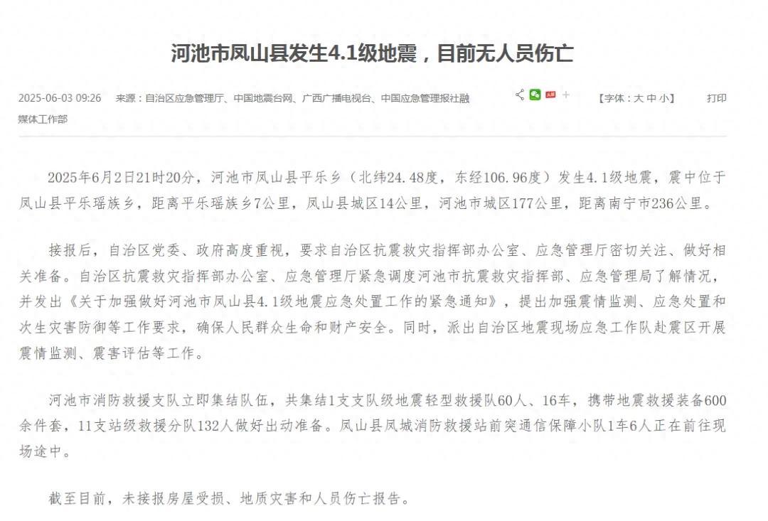 經覈實,網傳文章內容不實。6月3日上午,自治區應急管理廳發佈情況說明表示:2025年6月2日21時20分,河池市鳳山縣平樂鄉(北緯24.48度,東經106.96度)發生4.1級地震。截至目前,未接報房屋受損、地質災害和人員傷亡報告。