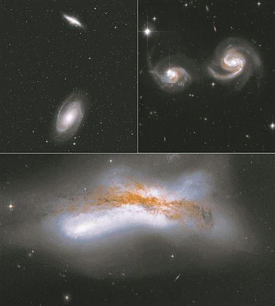 銀河系與仙女星系未來3種可能的碰撞情景。左上:兩星系擦肩而過。右上:兩星系逐漸靠近併發生近距離接觸。下圖:兩星系發生碰撞。 圖片來源:NASA/ESA