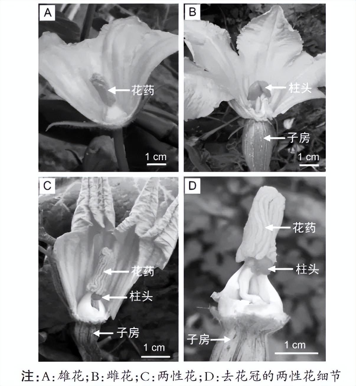 南瓜是典型的雌雄異花同株植物,學界普遍認爲南瓜花器官爲單性(即雌花或雄花),也有文獻報道南瓜存在罕見的兩性花(即雌雄同花)。[8]