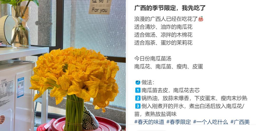 最近,正值南瓜花上市的季節。很多廣西網友都在網上紛紛曬出南瓜花做的美食,並表示南瓜花是廣西的季節限定,不少沒喫過的網友表示不可思議。