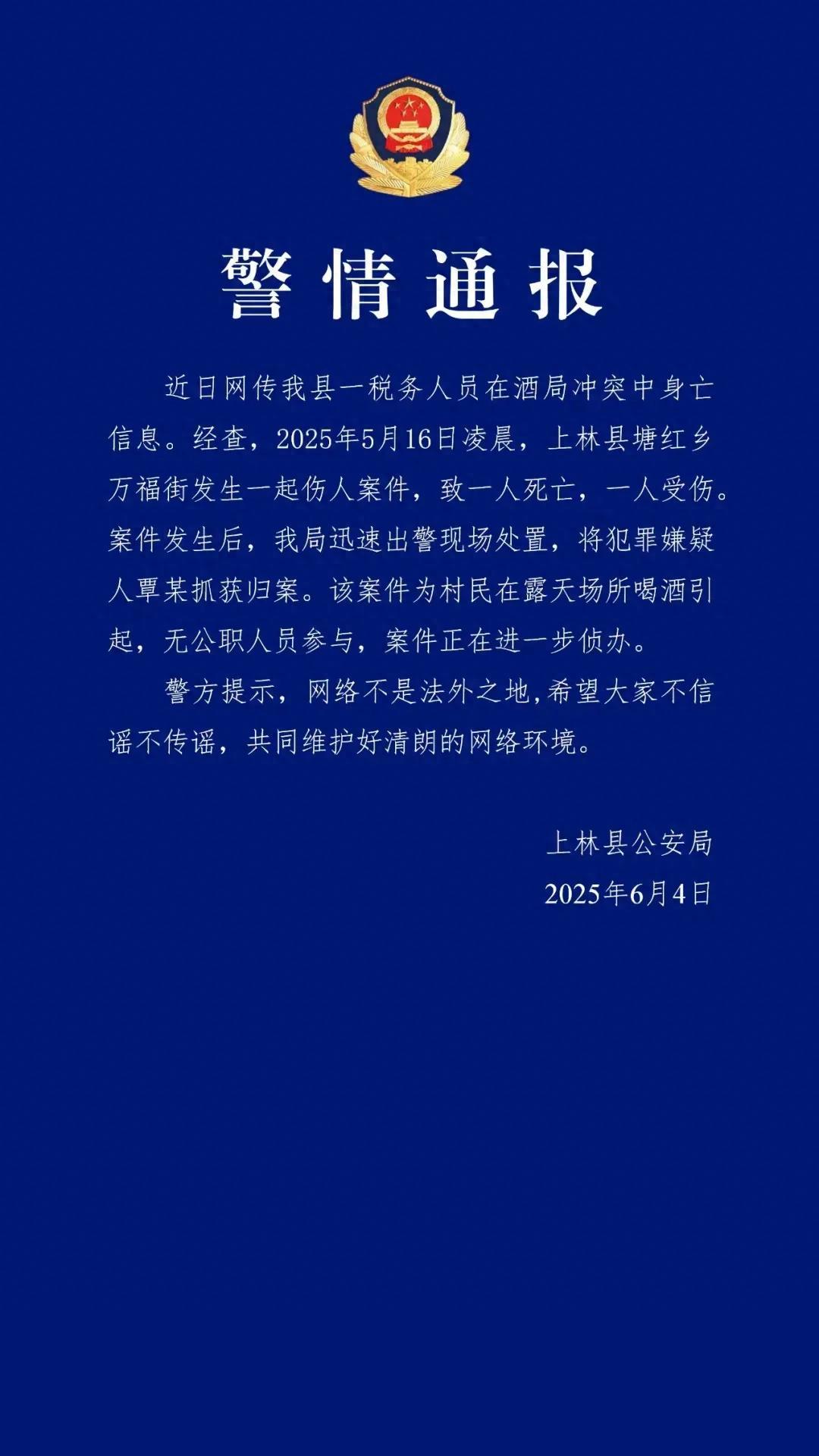 網傳上林一稅務人員在酒局衝突中身亡?警方通報:無公職人員參與