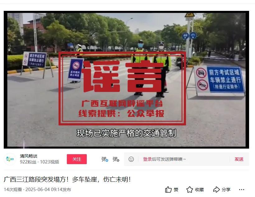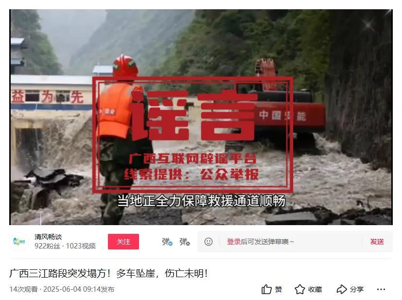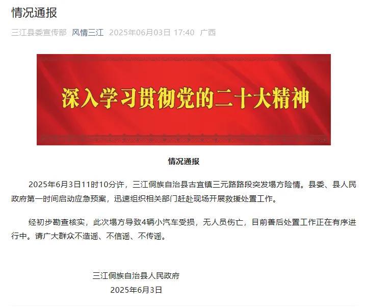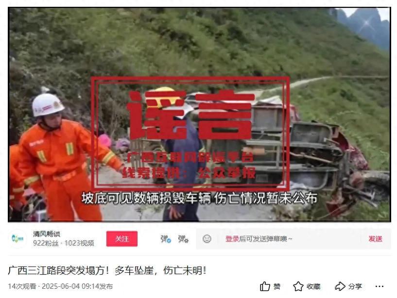 6月4日,有自媒體賬號在網絡發佈視頻,稱“廣西三江路段突發塌方!多車墜崖,傷亡未明”,引發網民關注。