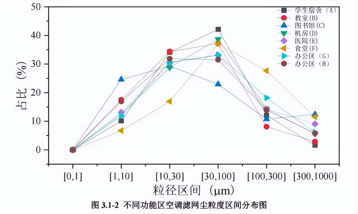 不同區域空調濾網的顆粒物粒徑分佈,圖片來源:參考文獻[1]