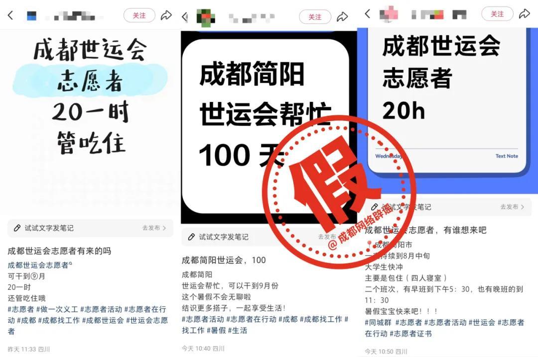 近日,個別網民在社交平臺借“成都世運會志願者”名義發佈兼職招聘廣告,內容包括工作內容、工作時間、時薪、住宿等,引發網民關注和討論。