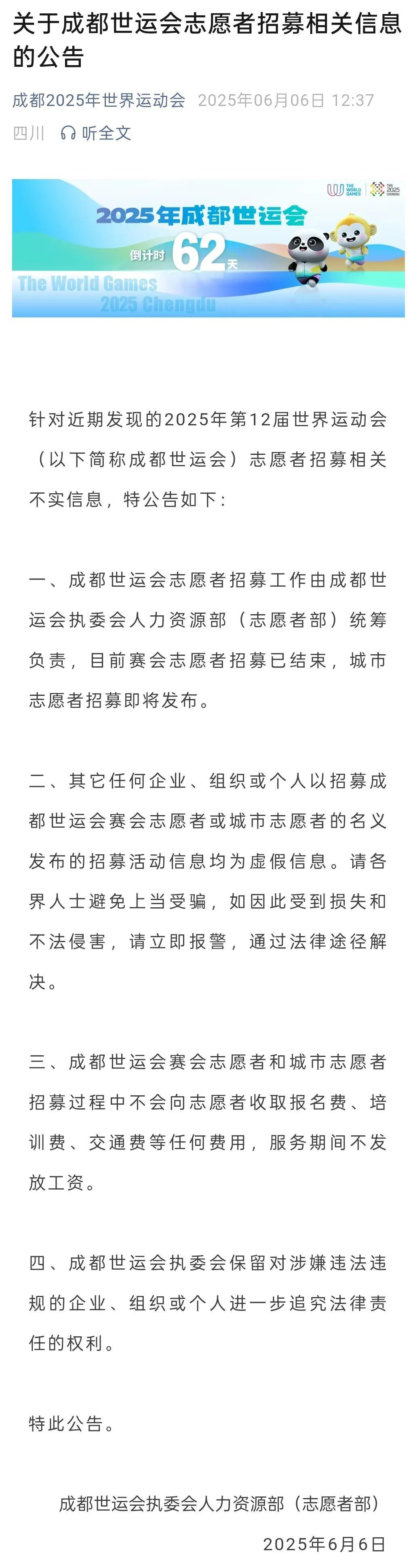 6月6日,成都世運會執委會人力資源部(志願者部)通過微信公衆號“成都2025年世界運動會”發佈公告稱,成都世運會志願者招募工作由成都世運會執委會人力資源部(志願者部)統籌負責,目前賽會志願者招募已結束,城市志願者招募即將發佈。其它任何企業、組織或個人以招募成都世運會賽會志願者或城市志願者的名義發佈的招募活動信息均爲虛假信息。請各界人士避免上當受騙,如因此受到損失和不法侵害,請立即報警,通過法律途徑解決。