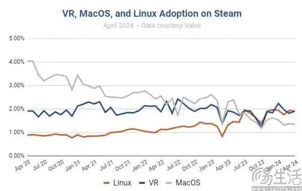 結果,Arcade 推出五年了,新增遊戲還是休閒手遊風,和玩家設想的“3A 大作”南轅北轍。2020-2024 年的四年裏,Steam 的 MacOS 用戶佔比已經從 4% 一路下降到了不足 2%,比 Linux 端還低。