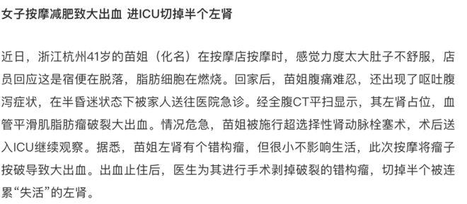 此外,還有一個常被忽視的問題:如果腎臟存在錯構瘤(如平滑肌脂肪瘤),則不應受到大力按壓。2022 年 11 月,就有報道一名女性因按摩導致脂肪瘤破裂,不得不緊急入院治療。