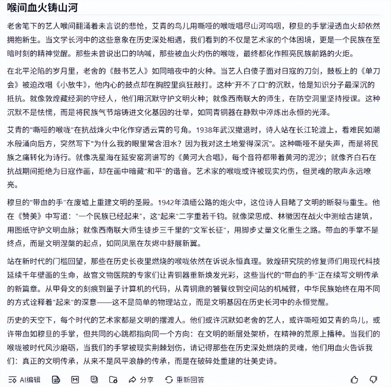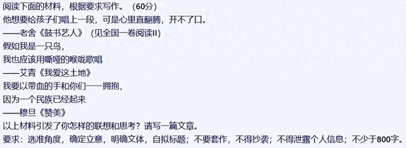 蘇老師:我給這篇作文打 45 分(滿分 60 )。我對全國卷評分標準不大瞭解,但是既然第一則材料來自閱讀II《鼓書藝人》,當然不能對閱讀II的基本情節理解有很大偏差。然而,就我看到的《鼓書藝人》內容,AI 作者恐怕是在一本正經地胡說八道,或者說出現了幻覺。老舍的原文中,鼓書藝人“開不了口”,是面對被戰爭摧殘的孩子,想給他們唱一段,又唱不出。但這篇文章,變成了不知哪來的角色“白傻子”面對日寇的刀劍保持沉默。出現這樣嚴重的失誤,所以我無法給出高分。