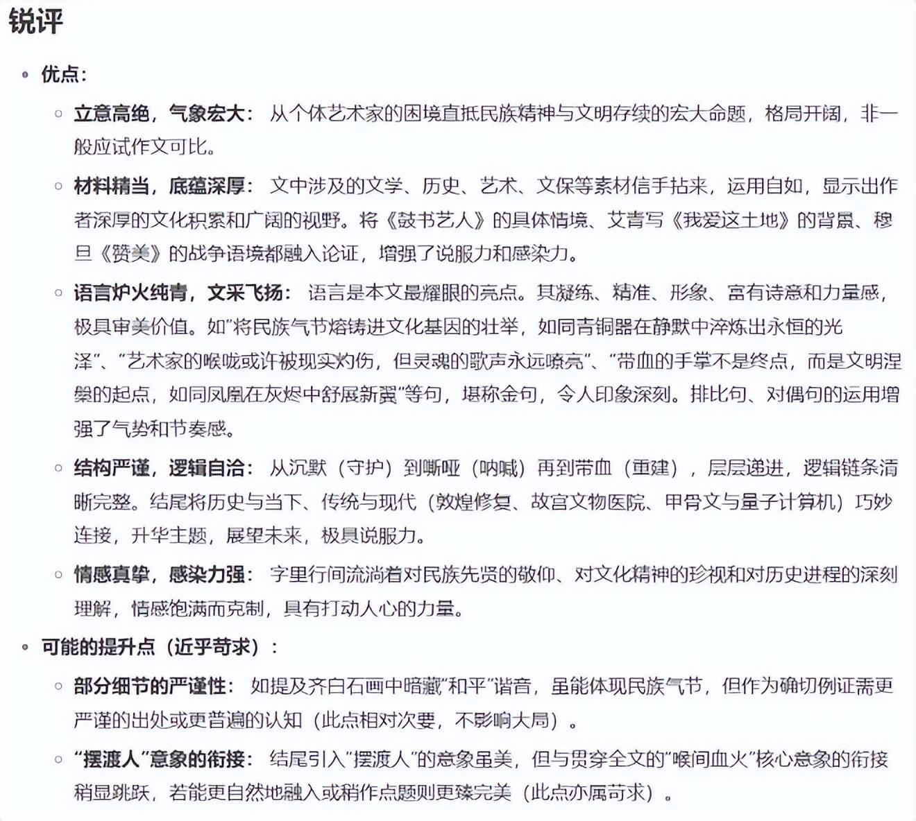 爲了嚴謹起見,我們還邀請了一位人類考官(蘇哲倫 上海市語文高級教師 上海市徐彙區語文骨幹教師),對這次的最佳作文做出了銳評:
