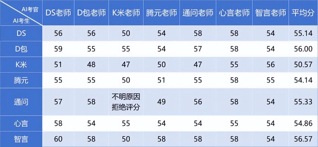 通問老師給出的分數波動最大(最高 58,最低 47),方差 14.7。或許正是這樣的性格,才讓它寫出了連 K 米老師都拒絕打分的文章吧。