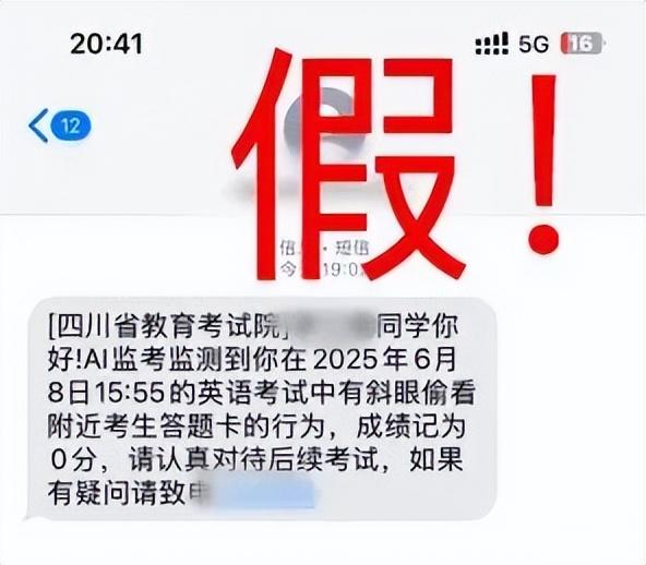 近日,部分高考考生收到所謂“四川省教育考試院”的短信,稱在考試中被AI監考發現其有作弊行爲,成績記爲0分。