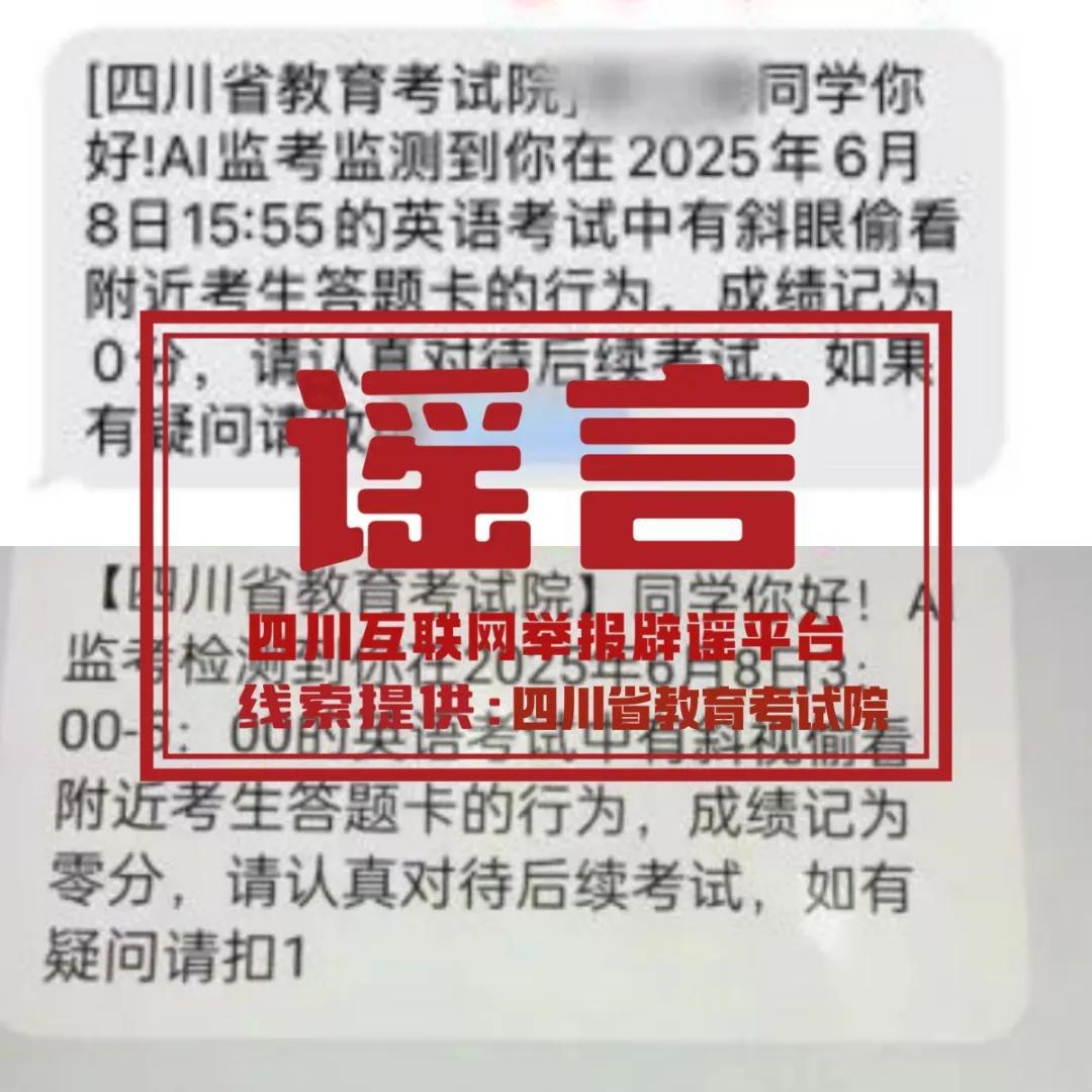 詳情:近日,部分高考考生收到所謂“四川省教育考試院”的短信,稱在考試中被AI監考發現其有作弊行爲,成績記爲0分。