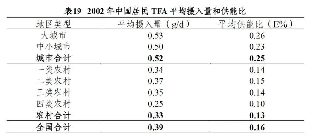 調查顯示,中國人平均每天喫的反式脂肪是 0.39 克,相當於供能比爲 0.16%,城裏人比農村人喫得多一些,平均供能比是 0.25%,在北京、廣州這種高端大氣上檔次的城市,反式脂肪的供能比也只有 0.34%,遠低於 WHO 的建議值。