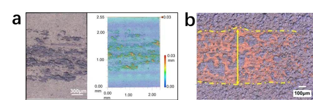 1000℃ 下摩擦 30 min(a)和 1000℃ 下摩擦 180 min(b)後材料磨損表面形態 圖片來源:蘭州化物所