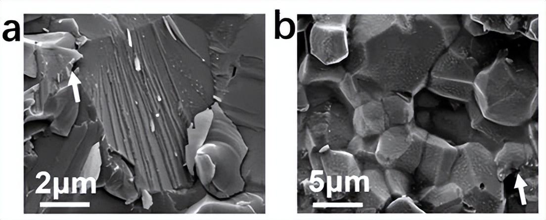 低溫 400℃ 下穿晶斷裂(a)和高溫 800℃ 下沿晶斷裂(b)特徵 圖片來源:蘭州化物理所