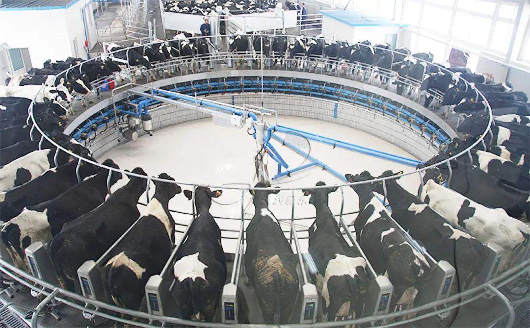 純手動擠奶幾乎已經被自動化擠奶系統替代,大型牧場會安裝轉盤式擠奶機,就像一個擠奶旋轉木馬,奶牛依次進入旋轉平臺上的擠奶位,一邊隨着平臺旋轉,一邊完成擠奶過程。這種擠奶方法雖然不再需要人手動擠,但依然需要人的參與,比如引導奶牛進入平臺、安裝擠奶杯、清潔和維護設備等,這就意味着不僅奶牛要凌晨2點開始上工,人也需要在那時加班。