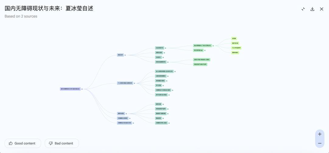 由於 source-grounded 的屬性,NotebookLM 的幻覺是降低了,但也意味着它並不能像 ChatGPT 那種生成式回答發散,不太能舉一反三。在用 NotebookLM 時,我不太擔心 AI 胡編亂造,最大的幻覺可能在於我瞅了一眼展開的思維導圖,覺得自己學到了太多……