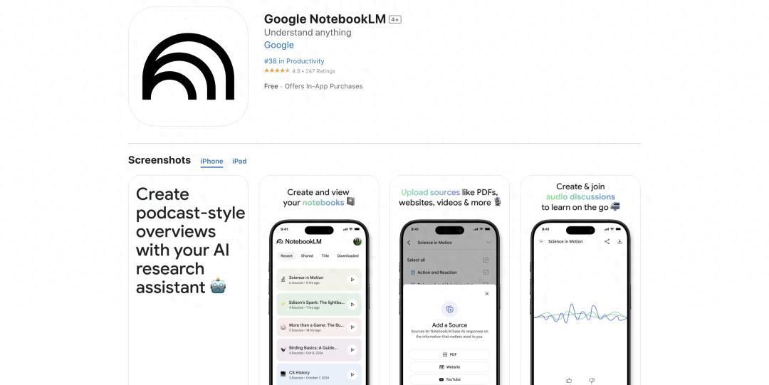 在不久前結束的 Google I/O 上,Google 悄咪咪地在安卓和 iOS 同時上線了一款“舊”app——NotebookLM。發佈當日,不到 24 小時,它就奪得蘋果 App Store 中生產工具類別的第二名。