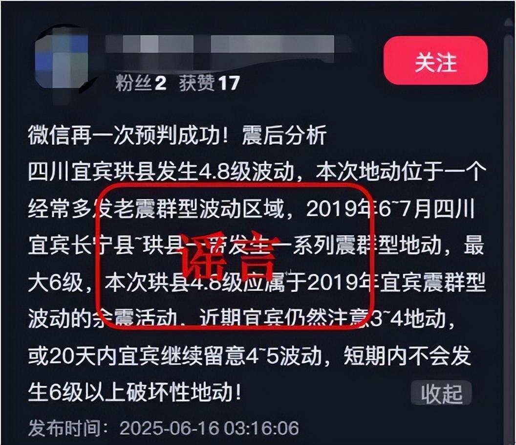 詳情:6月15日18時37分在四川宜賓市珙縣發生4.8級地震,震後網絡平臺上出現一些不實言論,對大家造成一定困擾。