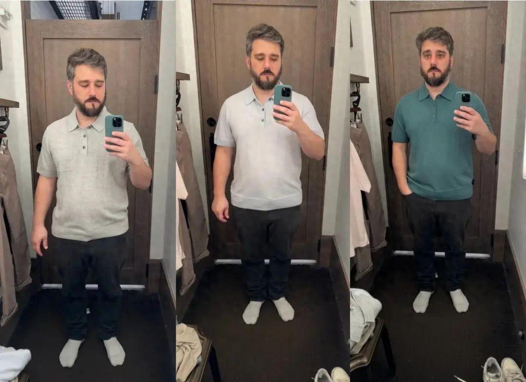 深色顯瘦,白色顯胖,啤酒肚的鼓起,手揣兜帶來的衣服下襬褶皺,都很自然。