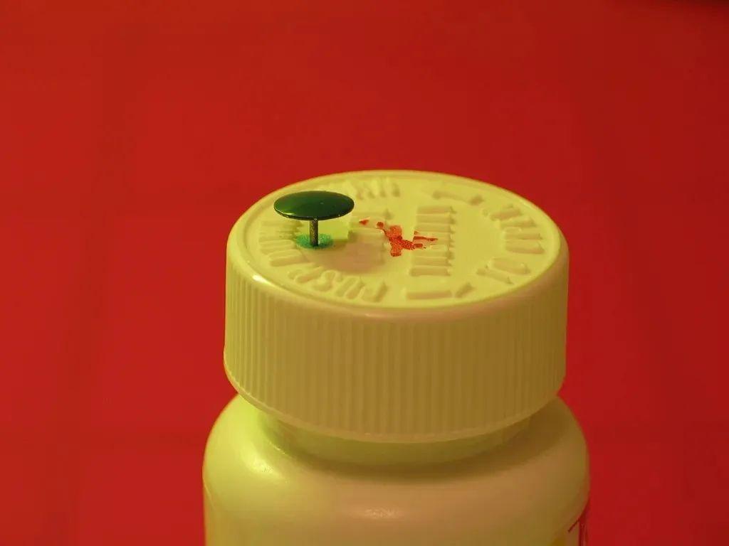 針對雙層設計的安全瓶蓋,用一枚圖釘刺入瓶蓋可以將內蓋與外蓋固定到一起,這樣就可以比較輕鬆地轉動內蓋打開瓶子。
