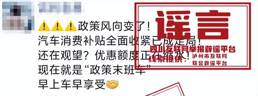 也就是說,網友稱"政策收緊"不存在此類情況。新印發的《瀘州市進一步推廣應用新能源汽車十條措施》顯示,在促進新能源汽車消費方面,瀘州將繼續加大新能源乘用車促銷和補貼。(來源:瀘州市互聯網聯合闢謠平臺)