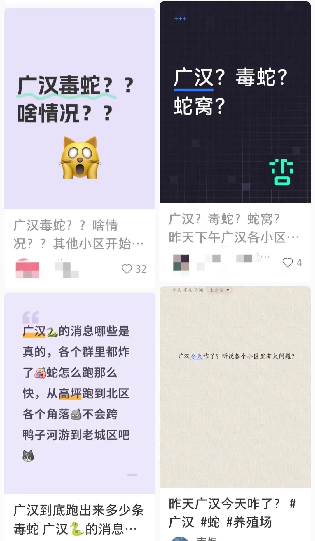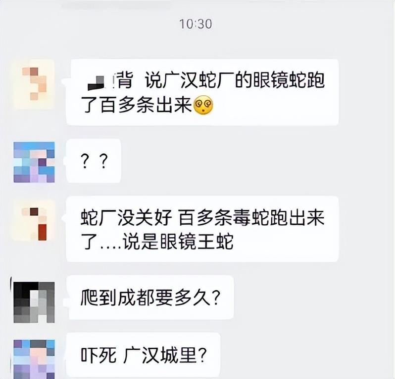 有人傳廣漢高坪某蛇廠跑出來幾十條毒蛇,更有人傳有幾百條蛇,還有人傳廣漢各個小區都在驅蛇。